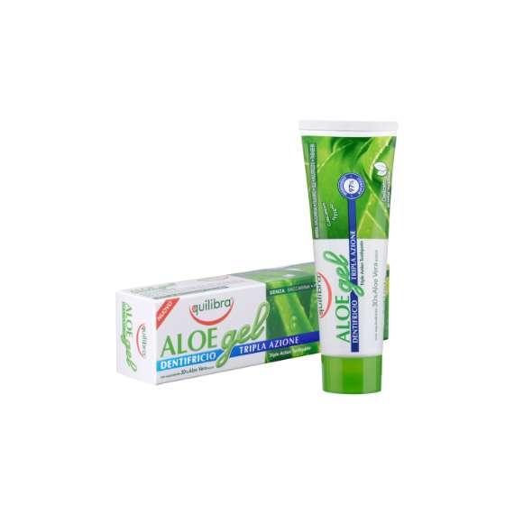 EQUILIBRA® Aloe gel dentifricio tripla azione è un gel delicato dal gusto fresco, privo di saccarina, che combina l’azione lenitiva dell’Aloe Vera, presente in formula in quantità pari al 30% del succo, e dellEscina all’azione antisettica dellOlio di Tea Tree. Il Mentolo rinfresca naturalmente il cavo orale. Utilizzato con regolarità, spazzolando correttamente i denti per almeno un minuto, aiuta a proteggere i denti dalla carie e dal tartaro, aiuta a prevenire i disturbi gengivali e assicura un alito fresco.