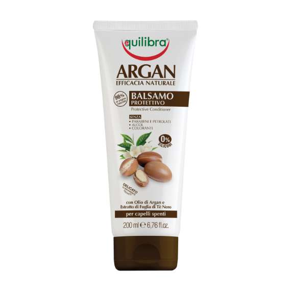 Equilibra Argan Balsamo Protettivo, ideale per capelli spenti, protegge e districa i capelli, grazie all’azione degli ingredienti attivi naturali presenti in formula. L’Olio di Argan nutre e protegge i capelli e il cuoio capelluto. I Condizionanti di Origine Vegetale, impiegati nella formula, districano delicatamente i capelli favorendone la pettinabilità, lasciando i capelli morbidi e luminosi. Con Estratto di Foglia di Tè Nero che rende i capelli lucidi e forti. Con Olio di Argan: dall’attività protettiva, nutriente ed emolliente.
