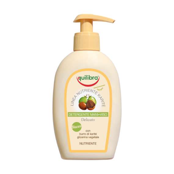 Equilibra Detergente mani-viso karitè è un detergente delicato ideale per l’igiene quotidiana della pelle delle mani e del viso. A base di burro di karitè e glicerina vegetale, sviluppa una schiuma cremosa che deterge e nutre la pelle restituendo morbidezza. I tensioattivi di origine vegetale, impiegati nella formula, detergono delicatamente rispettando il naturale equilibrio della pelle. Il Burro di karitè Equilibra puro al 100%, nutre, protegge e rende morbida la pelle delle mani e del viso.