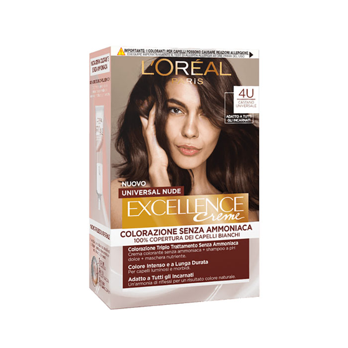 Excellence Universal Nude è la nuova COLORAZIONE TRIPLO TRATTAMENTO a tenuta permanente di L’Oréal Paris. Trattamento per il colore con la Crema Colorante Senza Ammoniaca e arricchita con attivi protettivi, per proteggere i capelli mentre li colora; trattamento per la cute grazie allo Shampoo a pH dolce post- colorazione, che deterge delicatamente la cute e i capelli; trattamento per i capelli grazie alla Maschera Nutriente Leggera, che nutre profondamente i tuoi capelli settimana dopo settimana senza appesantirli