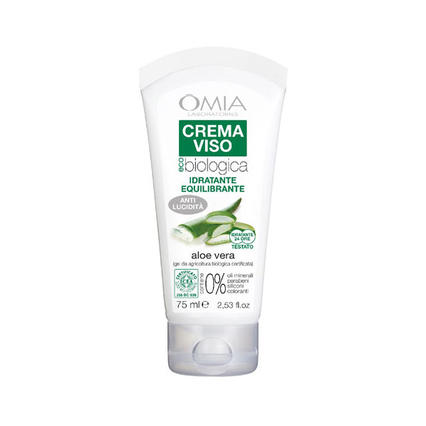 OMIA Crema Viso ecobiovisage con Aloe Vera è un trattamento idratante ed equilibrante per il benessere quotidiano del viso. La sua formula bilanciata giorno/notte contiene Aloe Vera BIO e una selezione di principi funzionali naturali e biologici che idratano ed equilibrano la pelle. Leggera sulla cute, non unge, si stende e si assorbe facilmente.