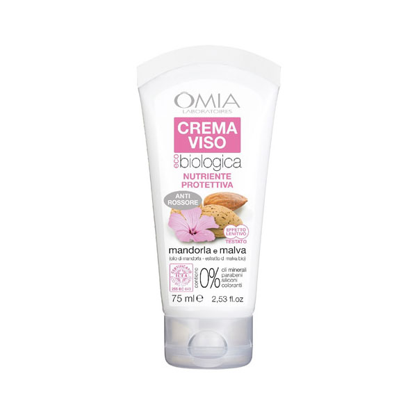 OMIA Crema Viso Eco-Biologica con Olio di Mandorla ed Estratto di Malva è un trattamento nutriente e protettivo per il benessere quotidiano del viso. La sua formula bilanciata giorno/notte contiene Olio di Mandorla ed Estratto di Malva BIO e una selezione di principi funzionali naturali e biologici che nutrono la pelle in profondità. Leggera sulla cute, non unge, si stende e si assorbe facilmente. La pelle è protetta e nutrita grazie ad una selezione di principi attivi tra i quali Olio di Mandorla ed Estratto di Malva, Acido Ialuronico, Olio di Borragine, Burro di Karitè e Vitamina E. Il prodotto contiene 0% di parabeni (paraben free, senza parabeni), 0% glicole propilenico, 0% PEG, 0% coloranti sintetici, 0% siliconi.