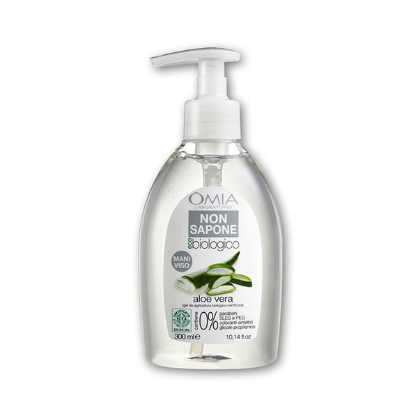 Omia Non Sapone mani viso eco biologico è un detergente fisiologico privo di sapone a base di aloe barbadensis miller da agricoltura biologica certificata.