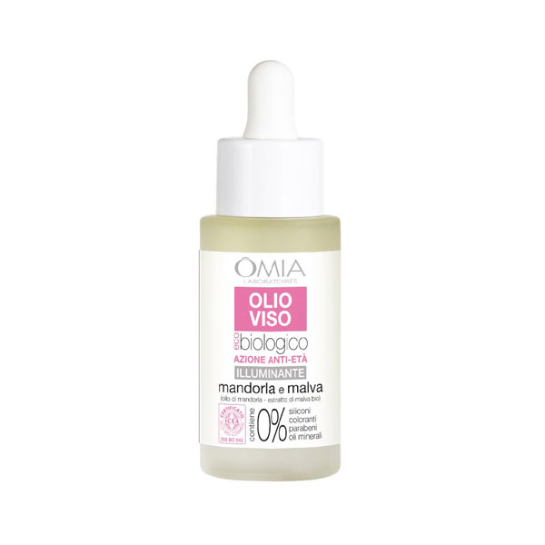 OMIA Olio Viso Eco-Biologico con Olio di Mandorla ed Estratto di Malva contrasta la comparsa delle rughe e uniforma l’aspetto ed il colorito della pelle grazie ad una preziosa selezione di oli anti-ossidanti. Con Olio di Mandorla ed Estratto di Malva Bio contrasta la comparsa delle rughe ed uniforma aspetto e colorito della pelle. Il prodotto contiene 0% di parabeni (paraben free, senza parabeni), 0% glicole propilenico, 0% PEG, 0% coloranti sintetici, 0% siliconi.