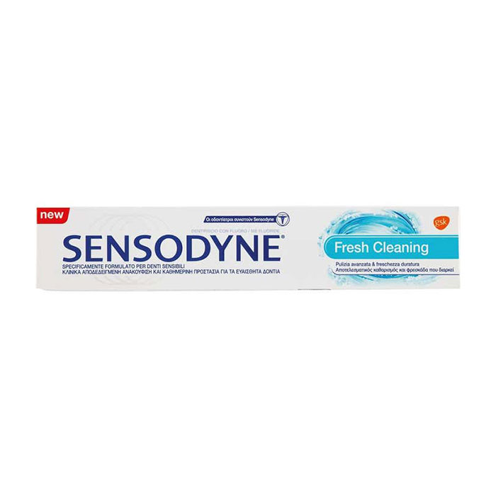 La formula di Sensodyne FRESH CLEANING è stata studiata per dare sollievo dalla sensibilità dentinale senza rinunciare ad una freschezza duratura e ad una piacevole sensazione data dalla sua tecnologia a rilascio di schiuma. Grazie al suo ingrediente specifico, appositamente formulato, Sensodyne FRESH CLEANING allevia il fastidio dei denti sensibili e aiuta a proteggere la dentina. La presenza di fluoro rinforza lo smalto e aiuta a proteggere dalla carie. La formula è stata sviluppata con un fresco sapore mentolato, per donare una freschezza che dura nel tempo. Usato 2 volte al giorno, Sensodyne FRESH CLEANING ti protegge per 24 ore dalla sensibilità dentinale e pulisce efficacemente.