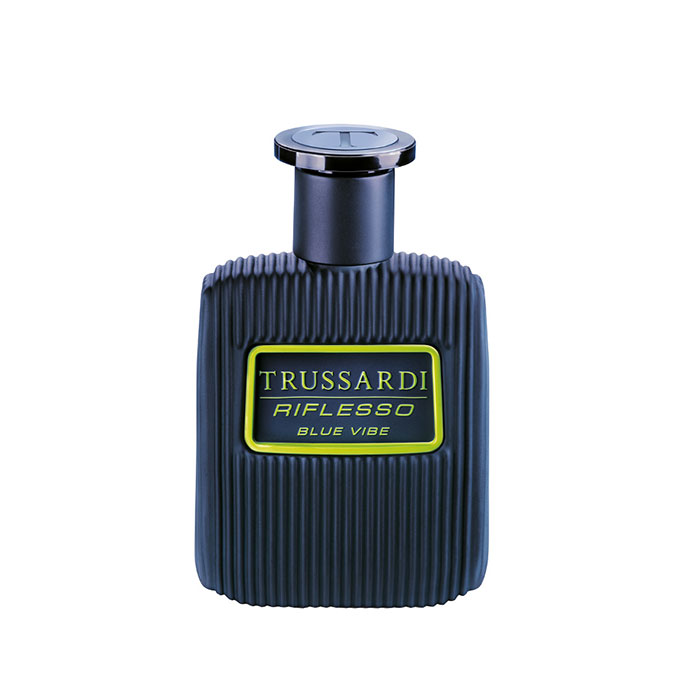 Trussardi Riflesso Blue Vibe rappresenta un viaggio introspettivo nella personalità maschile ricca di dualismi e seducenti sfumature. La creatività diventa un’arma e un rifugio sicuro dell’uomo contemporaneo, caratterizzato da unanima libera che sa piegarsi alla disciplina della vita quotidiana. Una fragranza giocata sui contrasti: caldo e freddo, razionale ed emozionale, elegante e sovversivo, dolce e amaro. Accordi di rhum, davana e yuzu si perdono nel cuore del Geranio e della nocciola per fondersi nel mondo incantato dellartemisia in contrasto con gli accordi legnosi. Opera del designer Carlo Colombo, il flacone blu scuro è satinato e ricoperto di scanalature su cui svettano le scritte verde lime incorniciate in un riquadro centrale con il nome Trussardi in rilievo.